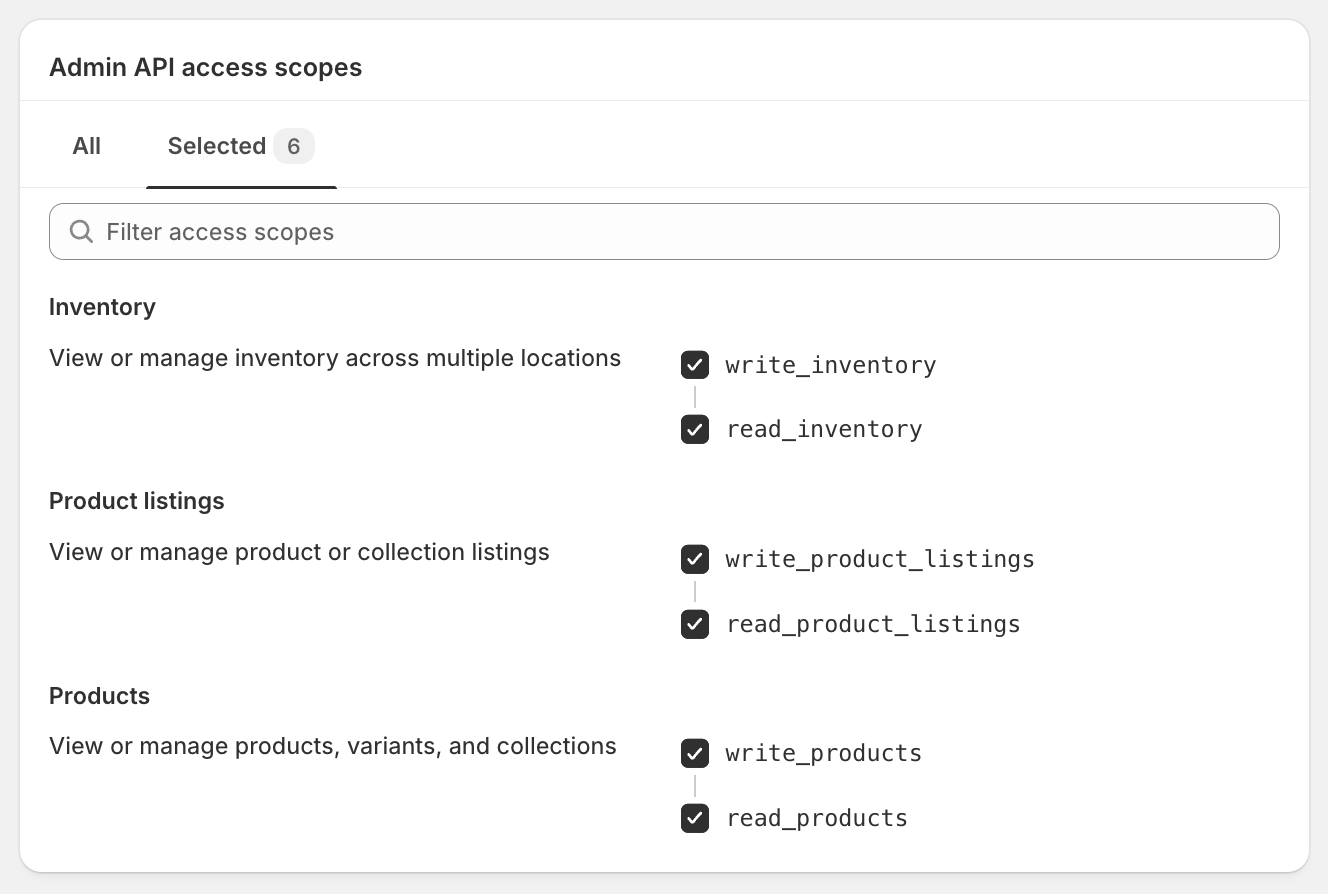 Step 10. In the "Admin API Integration" section. Under "Admin API access scopes" you'll see many categories. Search and enable following 6 scopes and Save: