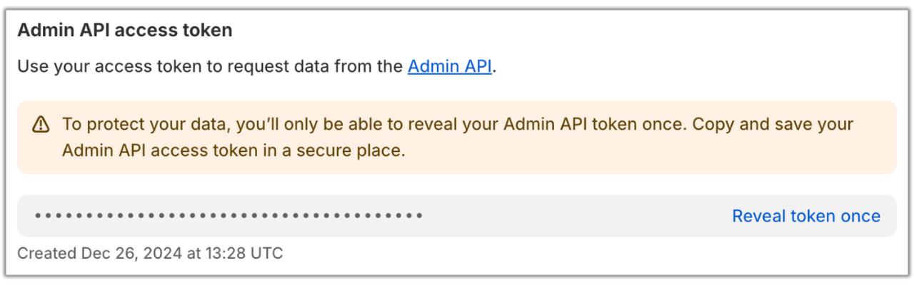 Step 4. Now you will see your Admin API Access Token has been generated. Click on "Reveal token once" and you will see the token.